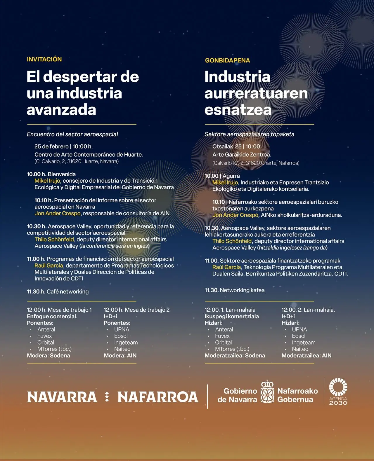 The second aerospace meeting of the Navarrese sector will take place on Tuesday 25 February at 10:00. This time, it is organised at the Huarte Contemporary Art Centre where dozens of companies belonging to the sector’s value chain will participate in the sessions and working tables that have been organised.
